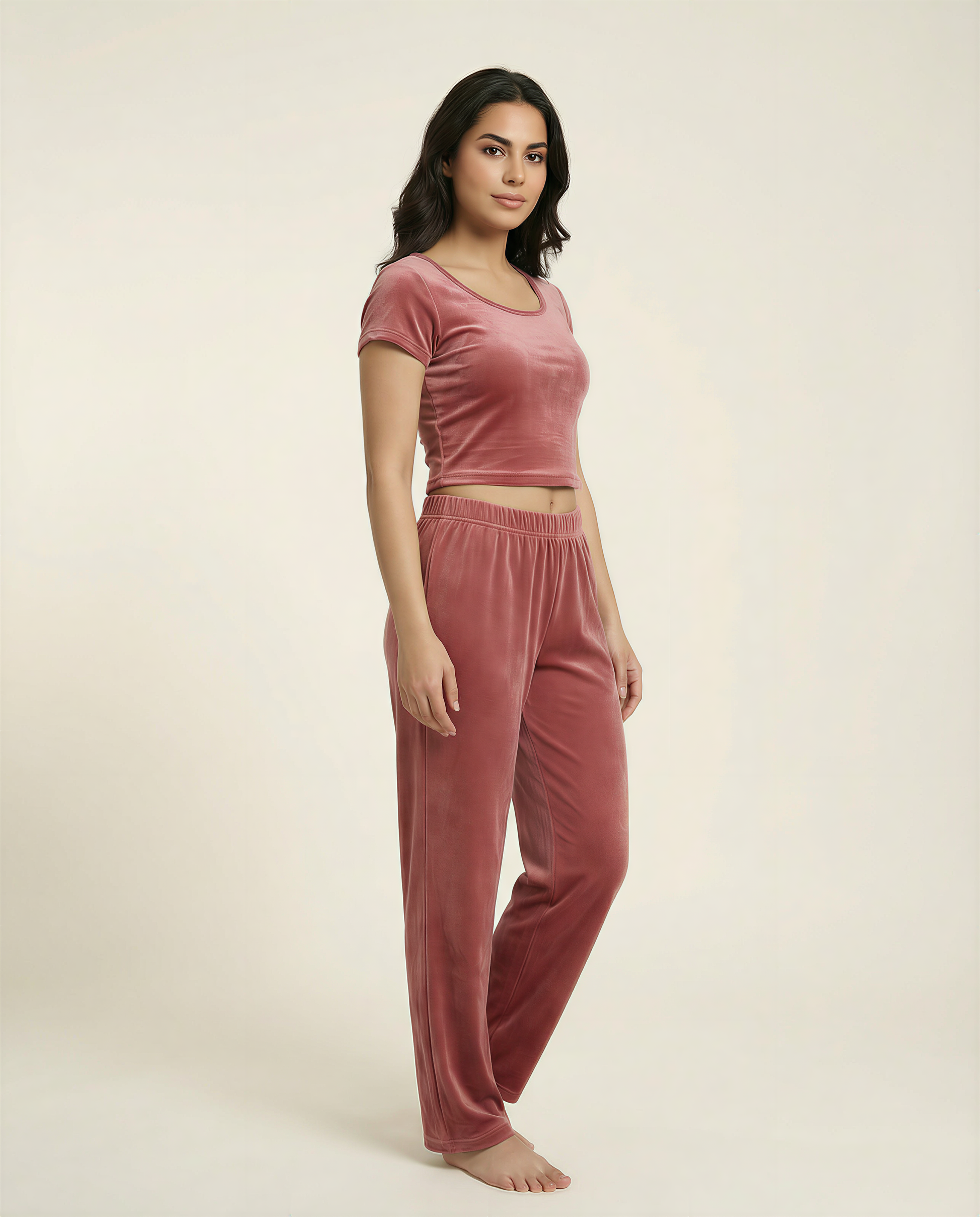 Premium Velvet a soft, plush fabric with a smooth surface and rich depth. Velvet offers warmth, comfort, and a subtle glow that elevates everyday loungewear.
